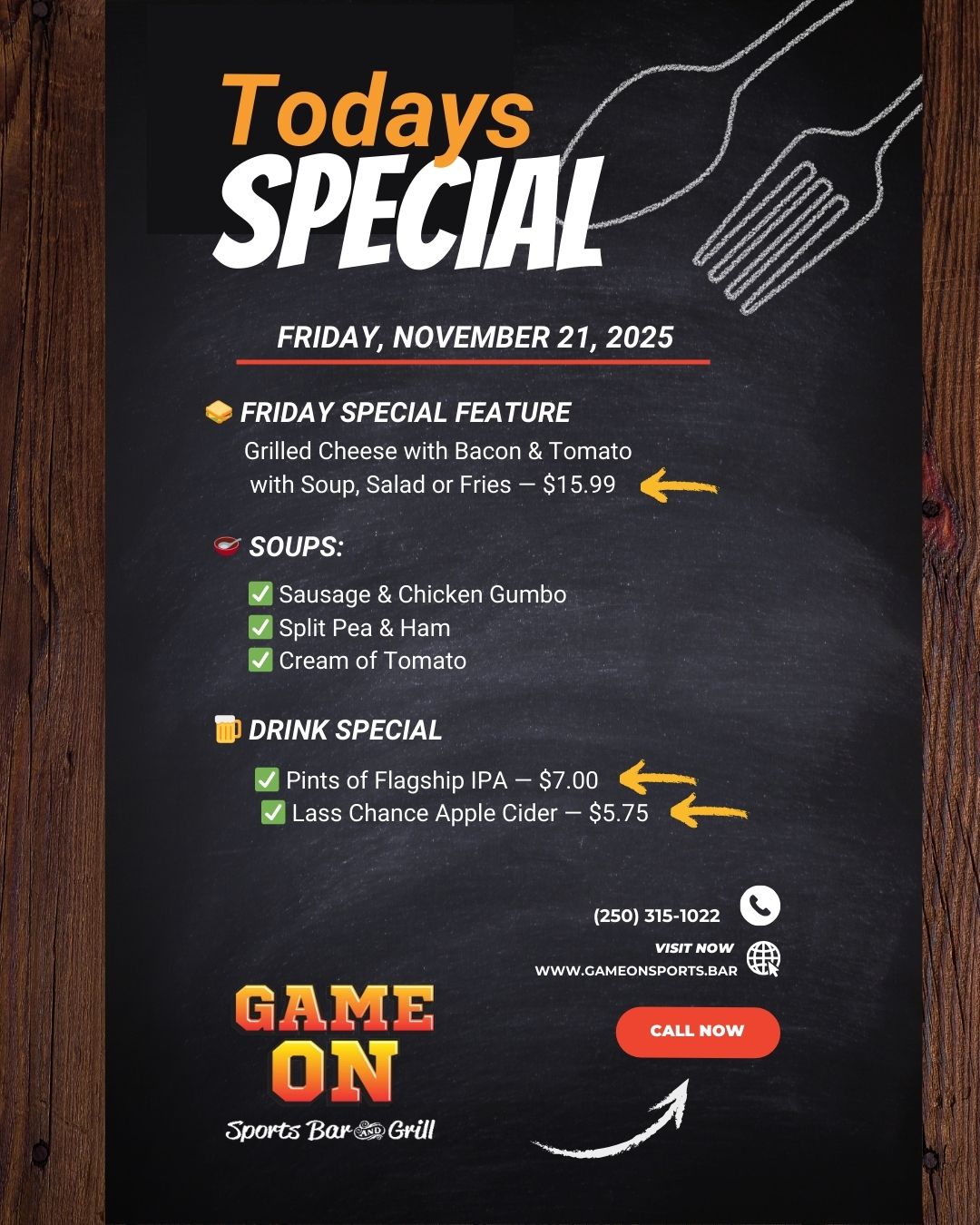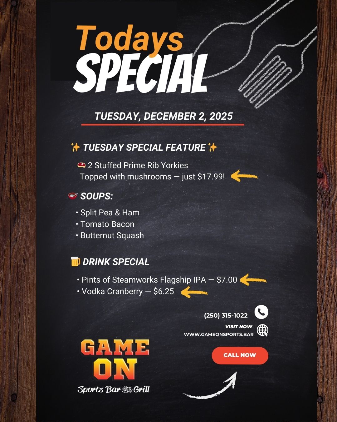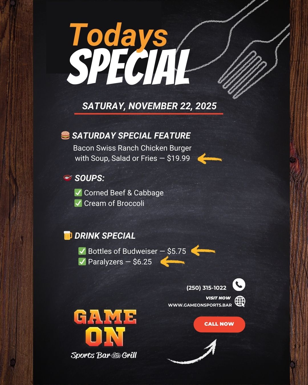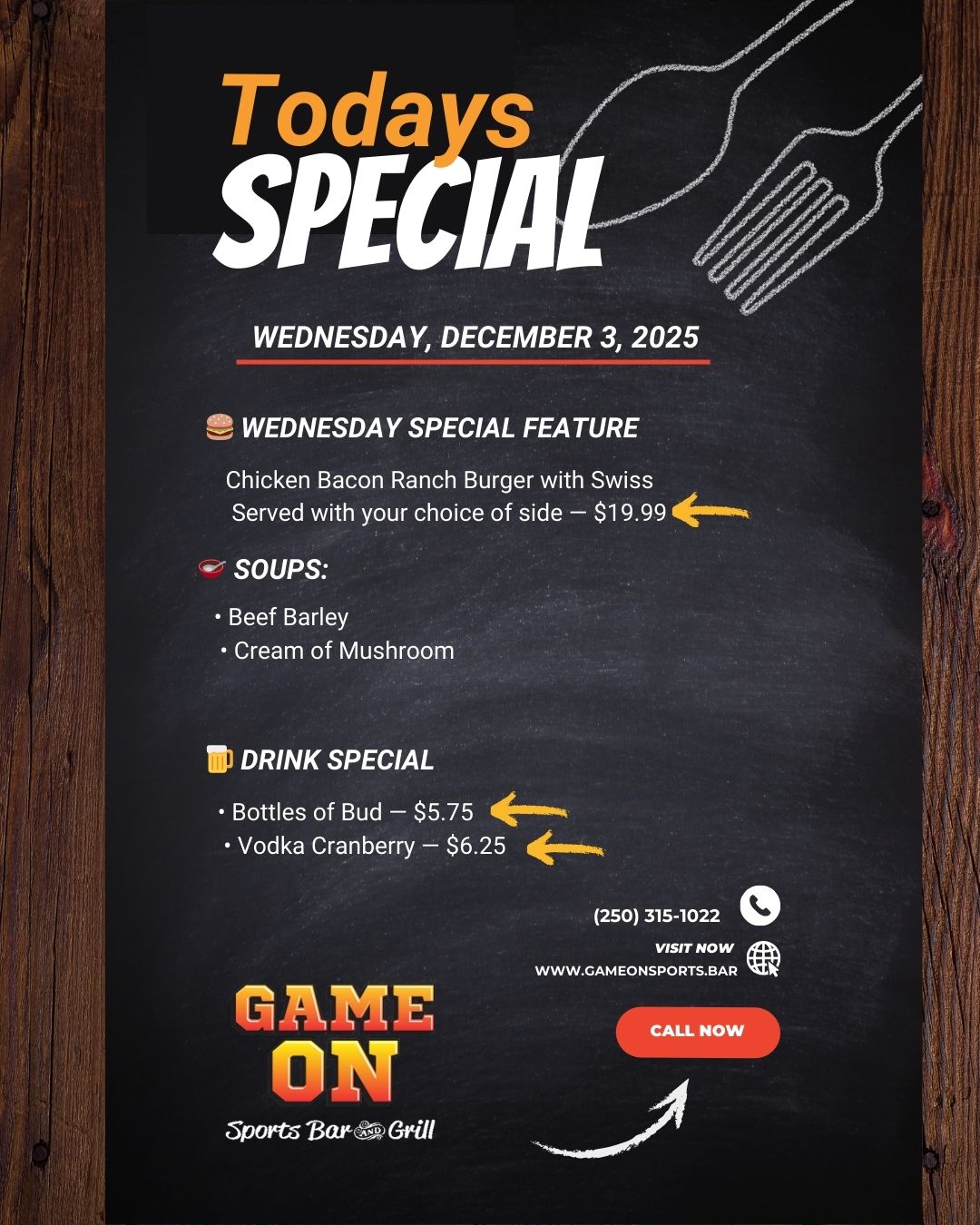 Game On Sports Bar & Grill 3701 Dewolf Way, Merritt, BCGet cozy with our Mushroom Swiss Burger β served with your choice of soup, salad...