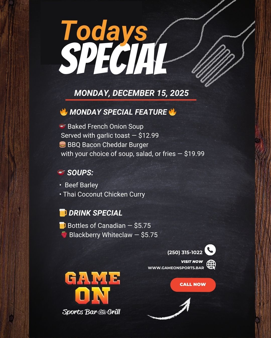 Game On Sports Bar & Grill 3701 Dewolf Way, Merritt, BCDig into our BBQ Bacon Cheddar Burger β served with your choice of soup, salad,...