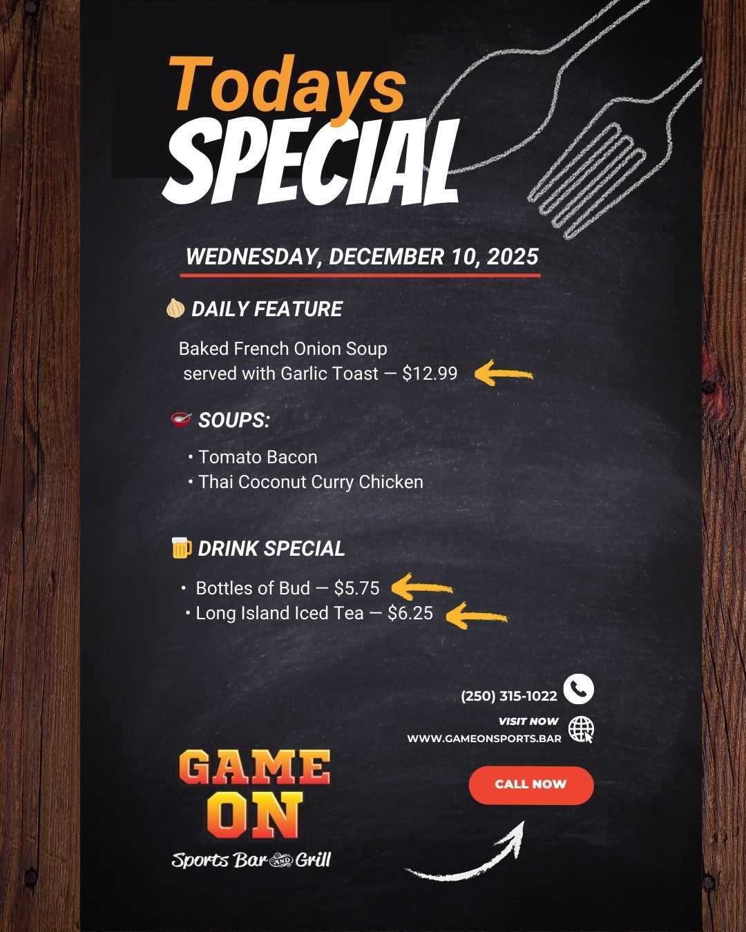 Baked French Onion Soupserved with Garlic Toast — $12.99 🥣 Soup of the Day •...