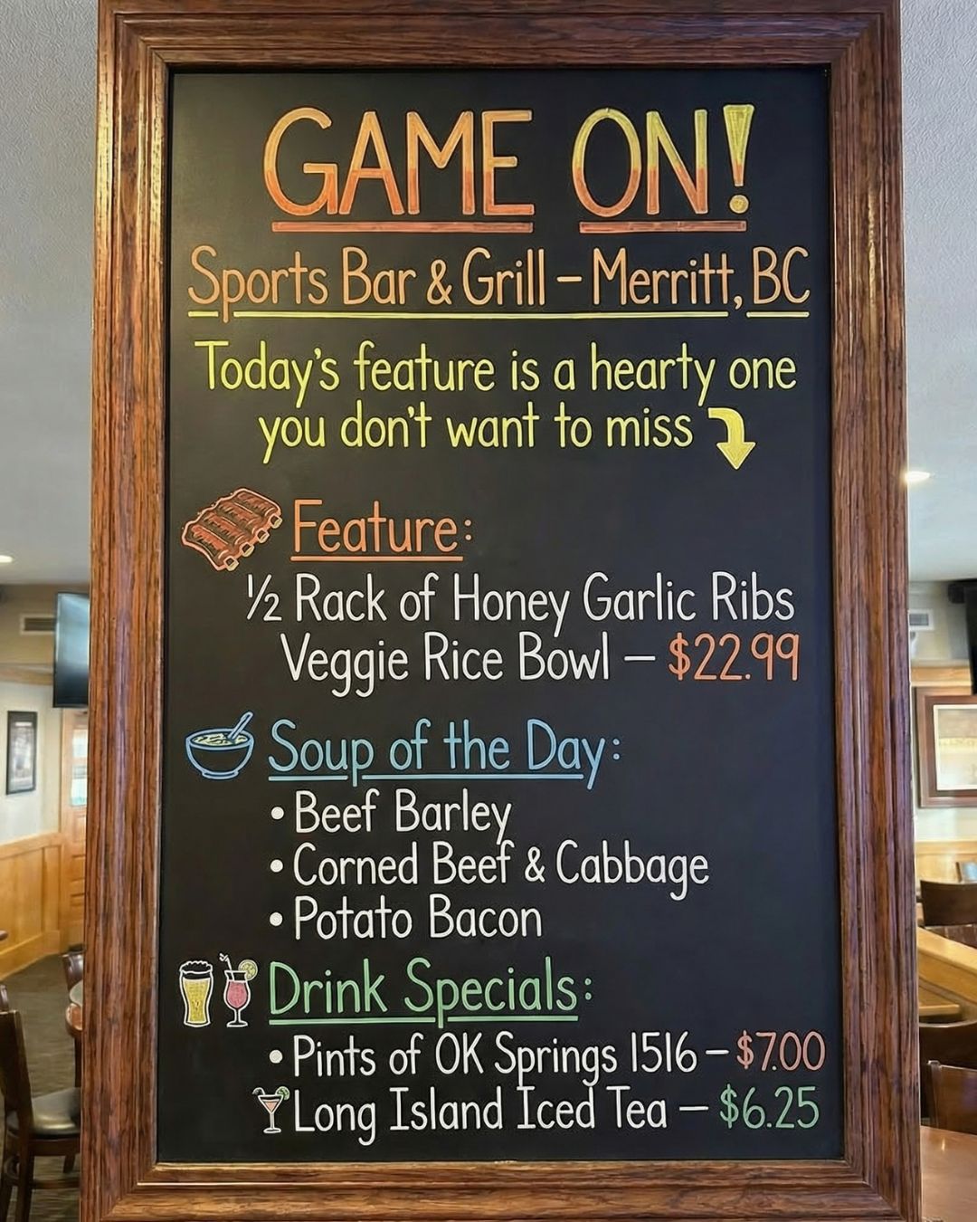 Game On Sports Bar & Grill 3701 Dewolf Way, Merritt, BCGAME ON Sports Bar & Grill – Merritt, BC Start the week with a little...