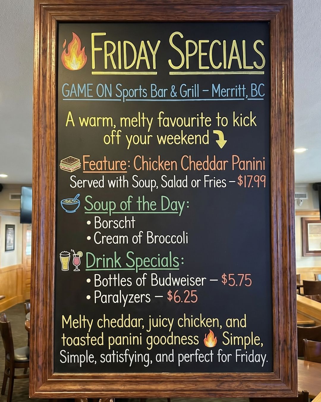 Game On Sports Bar & Grill 3701 Dewolf Way, Merritt, BCGAME ON Sports Bar & Grill β Merritt, BC Two comfort-food favourites on feature today...