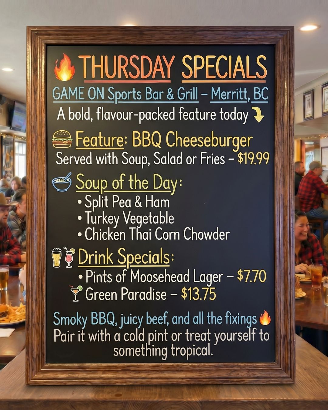 GAME ON Sports Bar & Grill β Merritt, BC A hearty favourite on feature today...