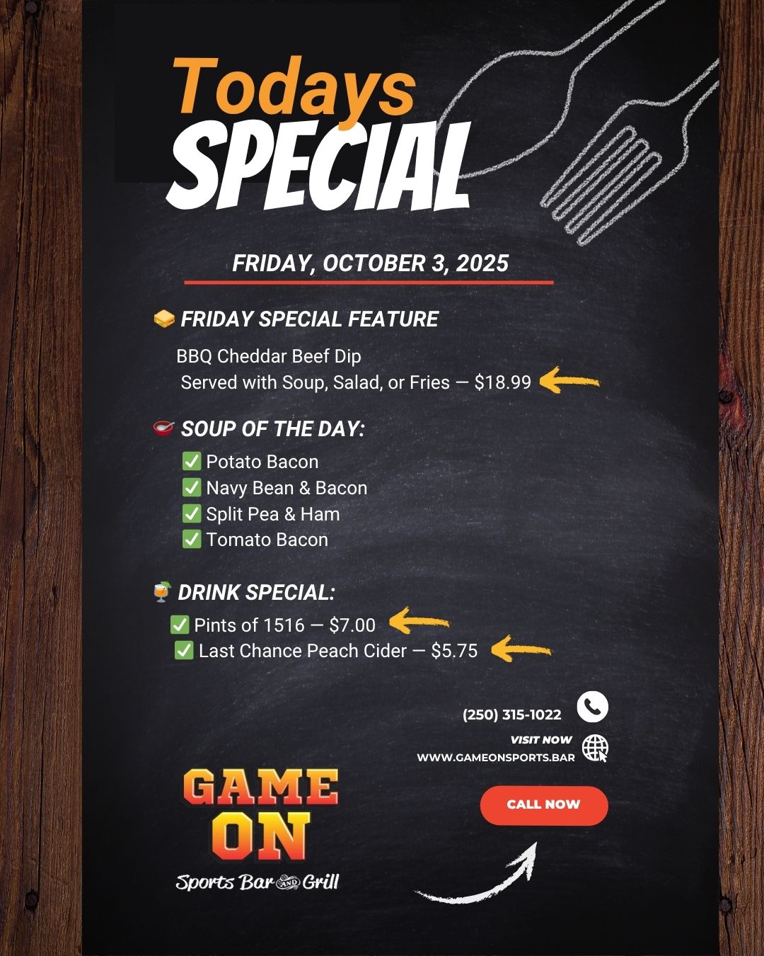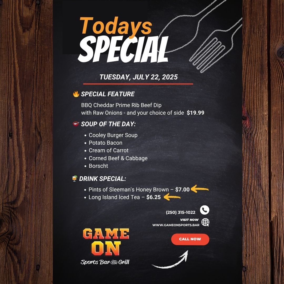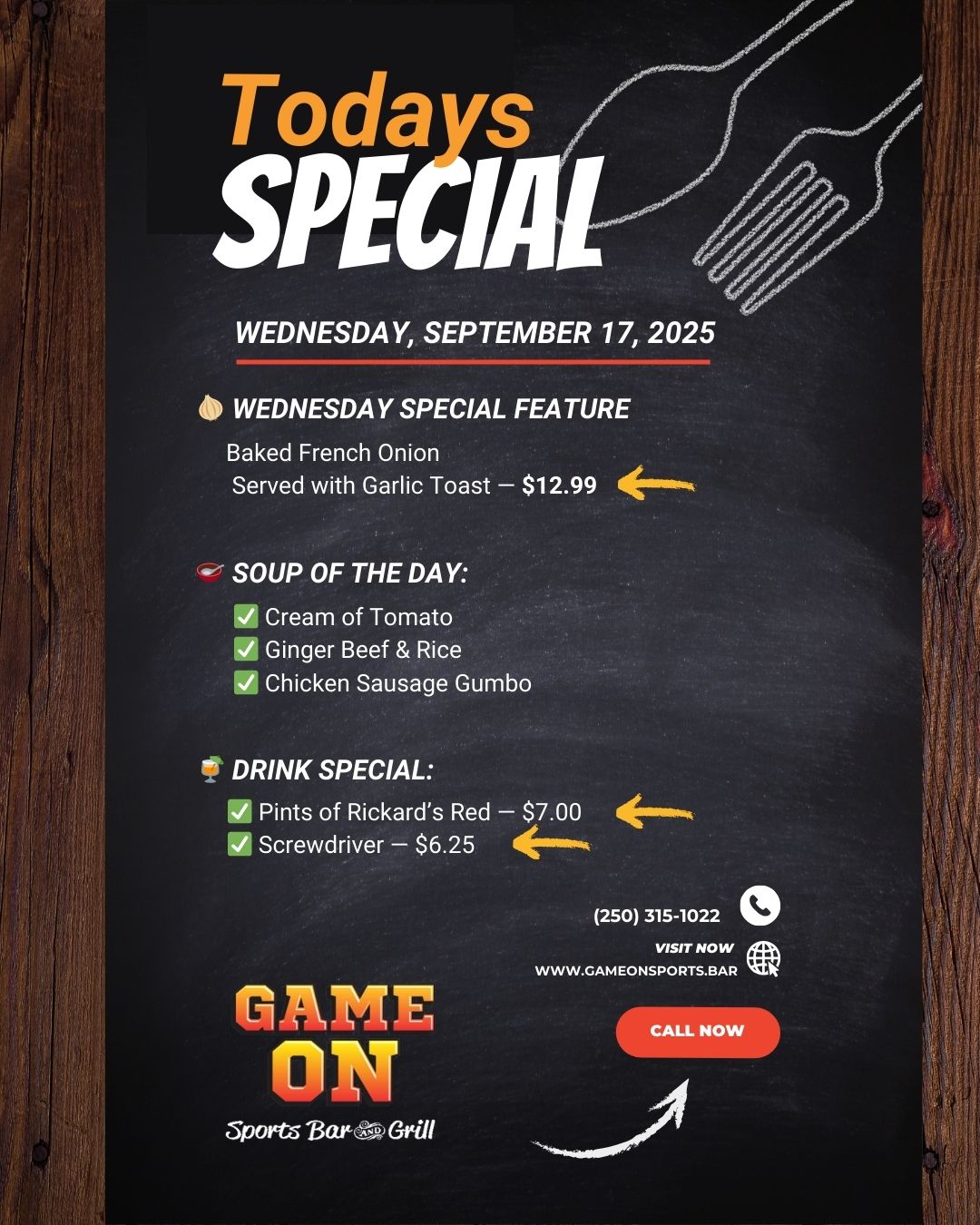 Baked French Onion Soupserved with Garlic Toast — $12.99 🥣 Soup of the Day •...