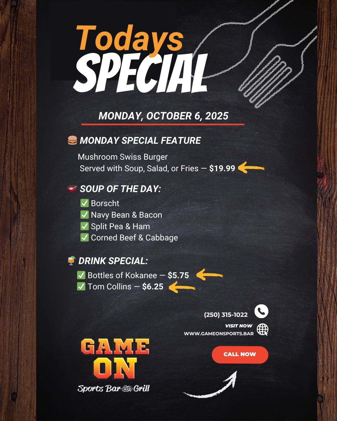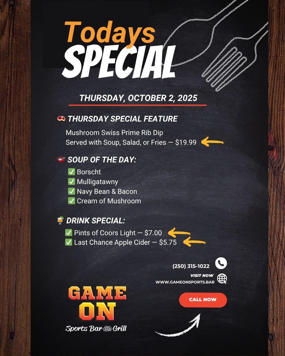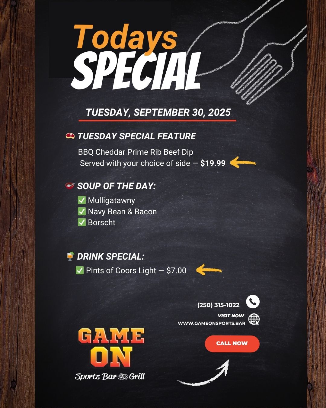 Baked French Onion Soupserved with Garlic Toast — $12.99 🥣 Soup of the Day •...