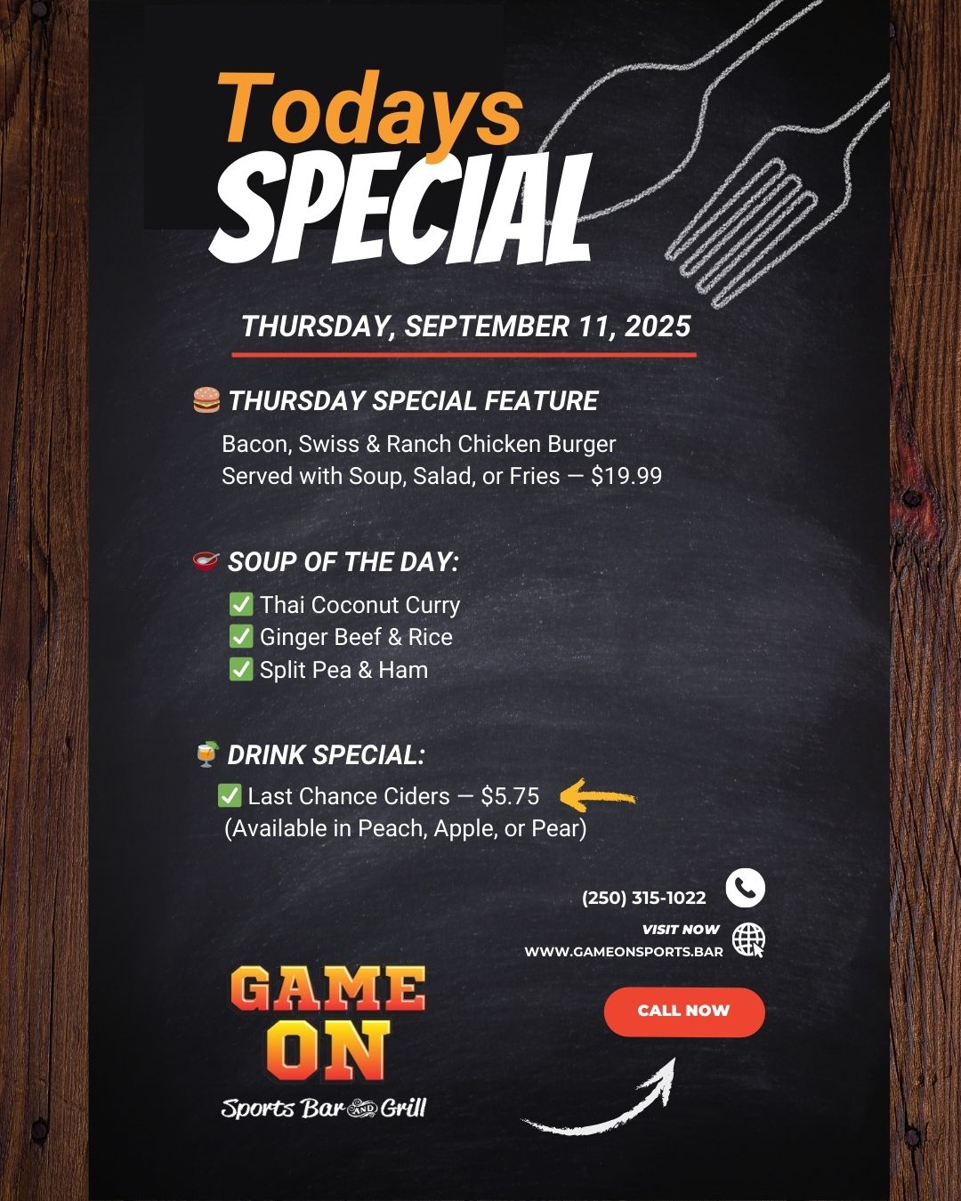 Chicken Bacon Ranch Burger with SwissServed with your choice of side — $19.99 🥣 Soup...