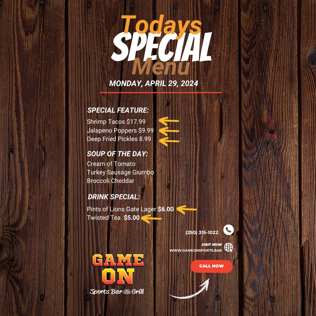 Soup of the Day: Potato Farmer Sausage Broccoli Chicken Beef Vegetable Drink Special: Caesars $5.40...