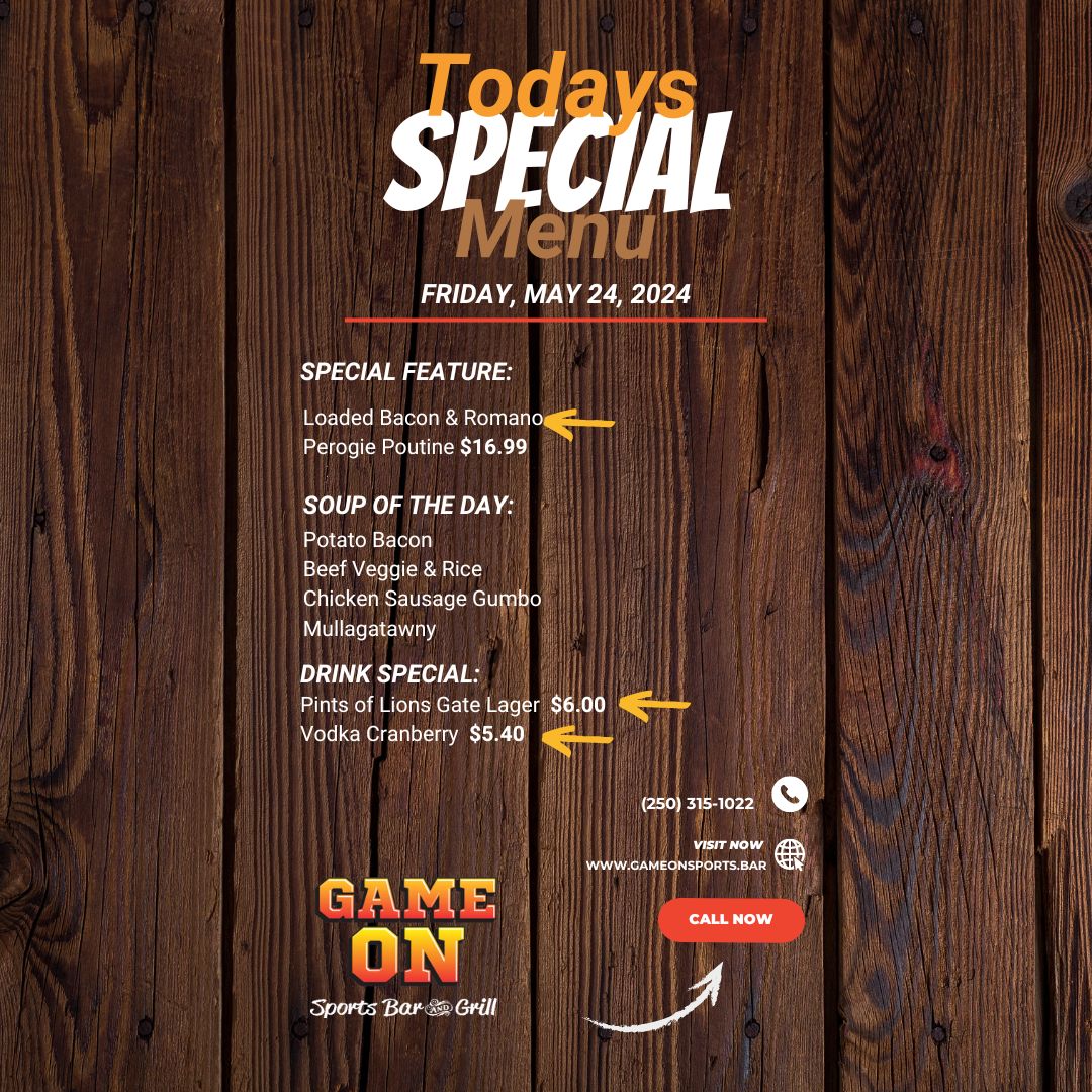 Loaded Bacon & Romano Perogie Poutine $16.99 Soup of the Day: Potato Bacon Beef Veggie...