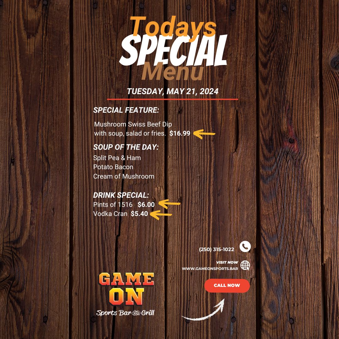 Mushroom Swiss Beef Dip with soup, salad or fries. $16.99 Soup of the Day: Corned...