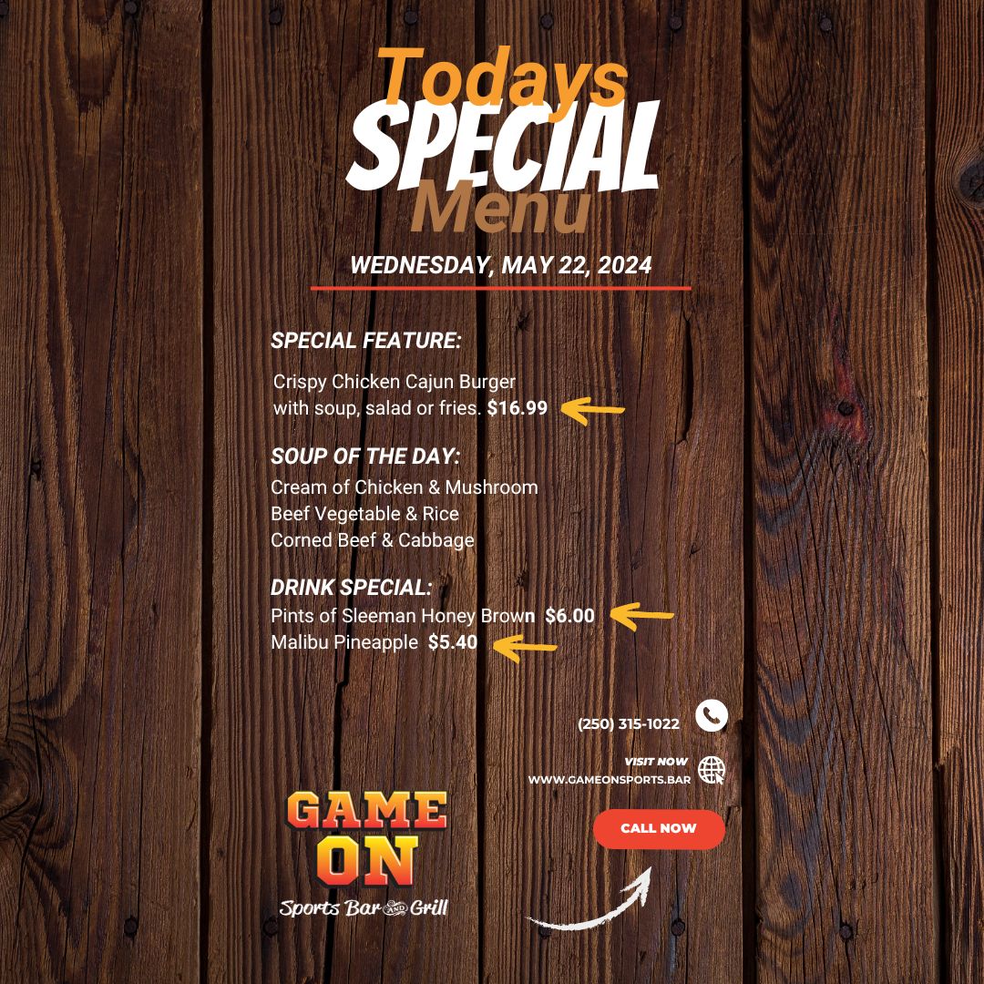 Crispy Chicken Cajun Burger with soup, salad or fries. $16.99 Soup of the Day: Cream...