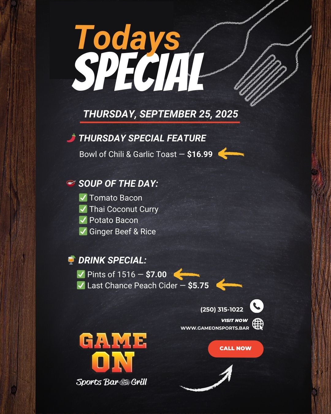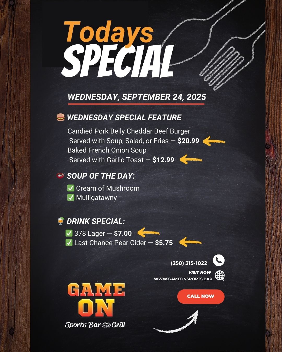 Baked French OnionServed with Garlic Toast — $12.99 🥣 Soup of the Day ✅ Cream...